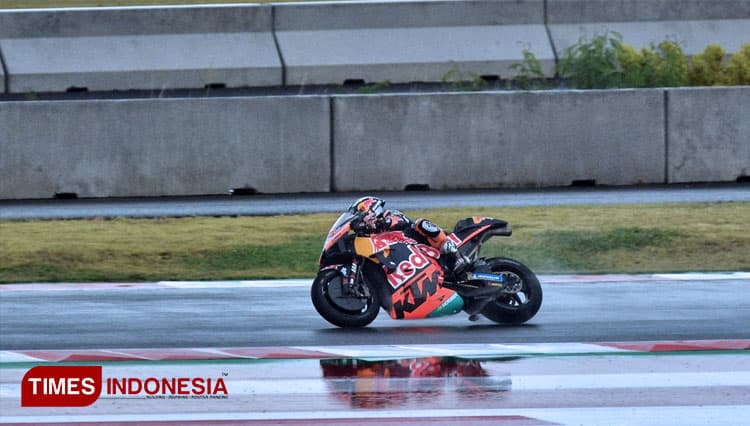 TIMES Jember/Pembalap tim Red Bull KTM, Miguel Oliveira melahap trek basah Sirkuit Mandalika, saat lomba seri kedua MotoGP di Mandalika, Lombok, NTB, Minggu (20/3/2022). (FOTO: Tria Adha/TIMES Indonesia)