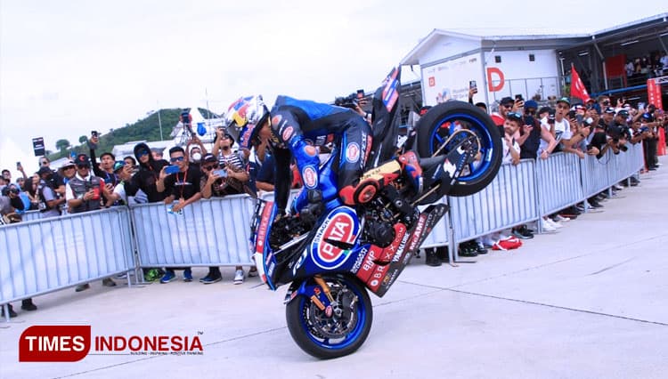 TIMES Jember/Pembalap PATA Yamaha Brixx Toprak Razgatlioglu melakukan atraksi stopie ban depan usai memenangi race 1 WSBK Mandalika 2022, Sabtu (12/11/2022). (FOTO: Tria Adha/TIMES Indonesia).