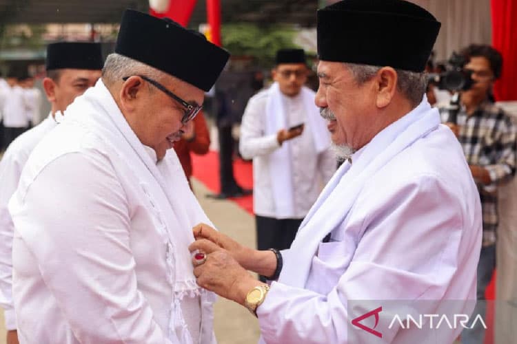 TIMES Jember/Pimpinan pesantren Insafuddin Banda Aceh memberikan kain kepada Sekda Aceh Bustami Hamzah usai peringati Hari Santri, di Banda Aceh, Selasa (24/10/2023). (FOTO: ANTARA/HO/Humas Pemprov Aceh)